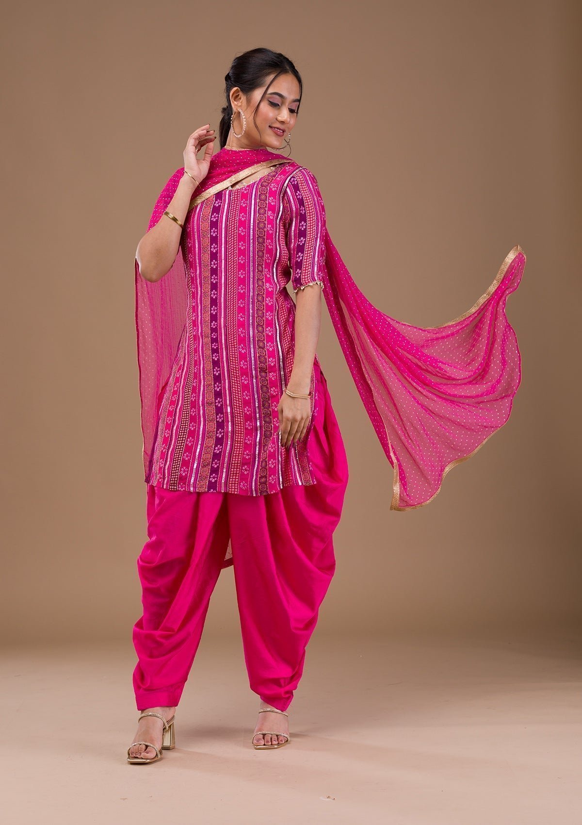 Product Category: Readymade Salwar SuitFabric: BandhiniWork: ZariworkColor: Rani PinkSecondary Work:Top Length: Knee LengthTop Style: Straight cutNeckline: Round necklineSleeve Type: SleevelessDupatta Fabric: ChiffonDupatta Color: PinkBottom Style: PatiyalaBottom Work: SolidPack Contains: 3N