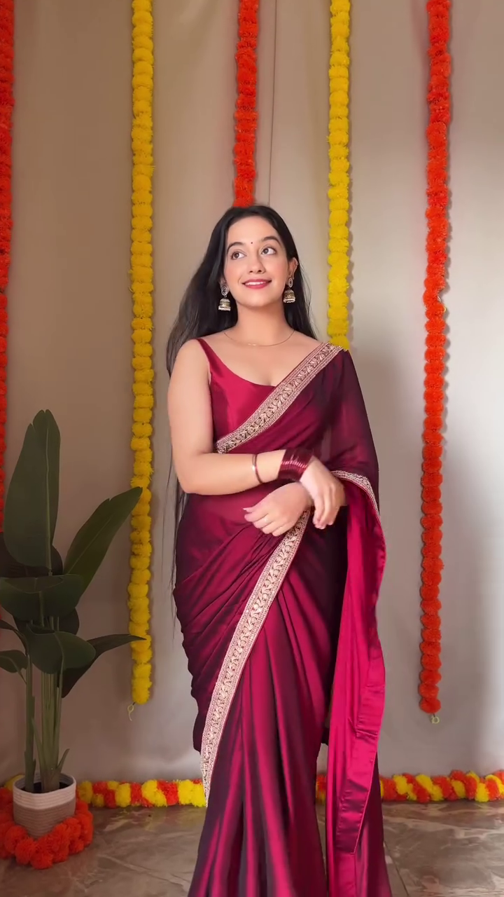 Luxurious Wine Satin Saree with Embroidered Border – Elegant Party & Festive Wear