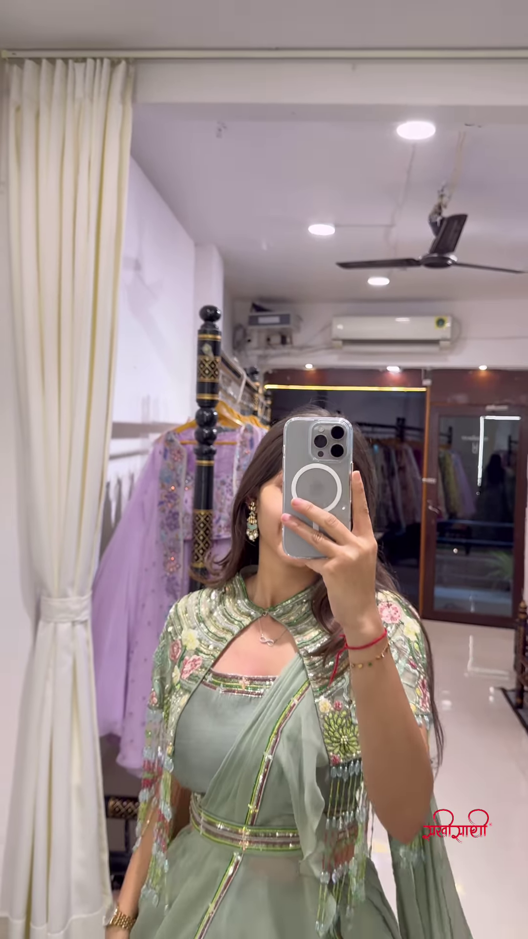 Pair with silver earrings or ear cuffs, and minimal bangles for a sleek finish. Hair can be styled in loose waves or a neat bun to highlight the cape. Opt for soft glam makeup—glittery eyes and nude lips match the pastel charm beautifully.