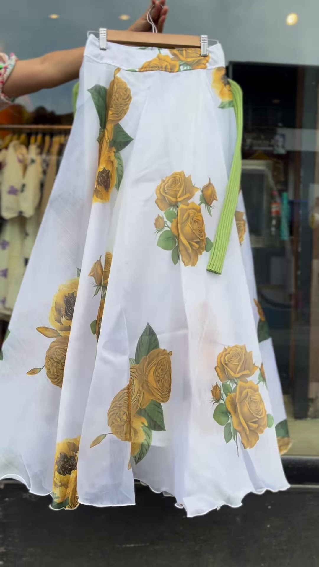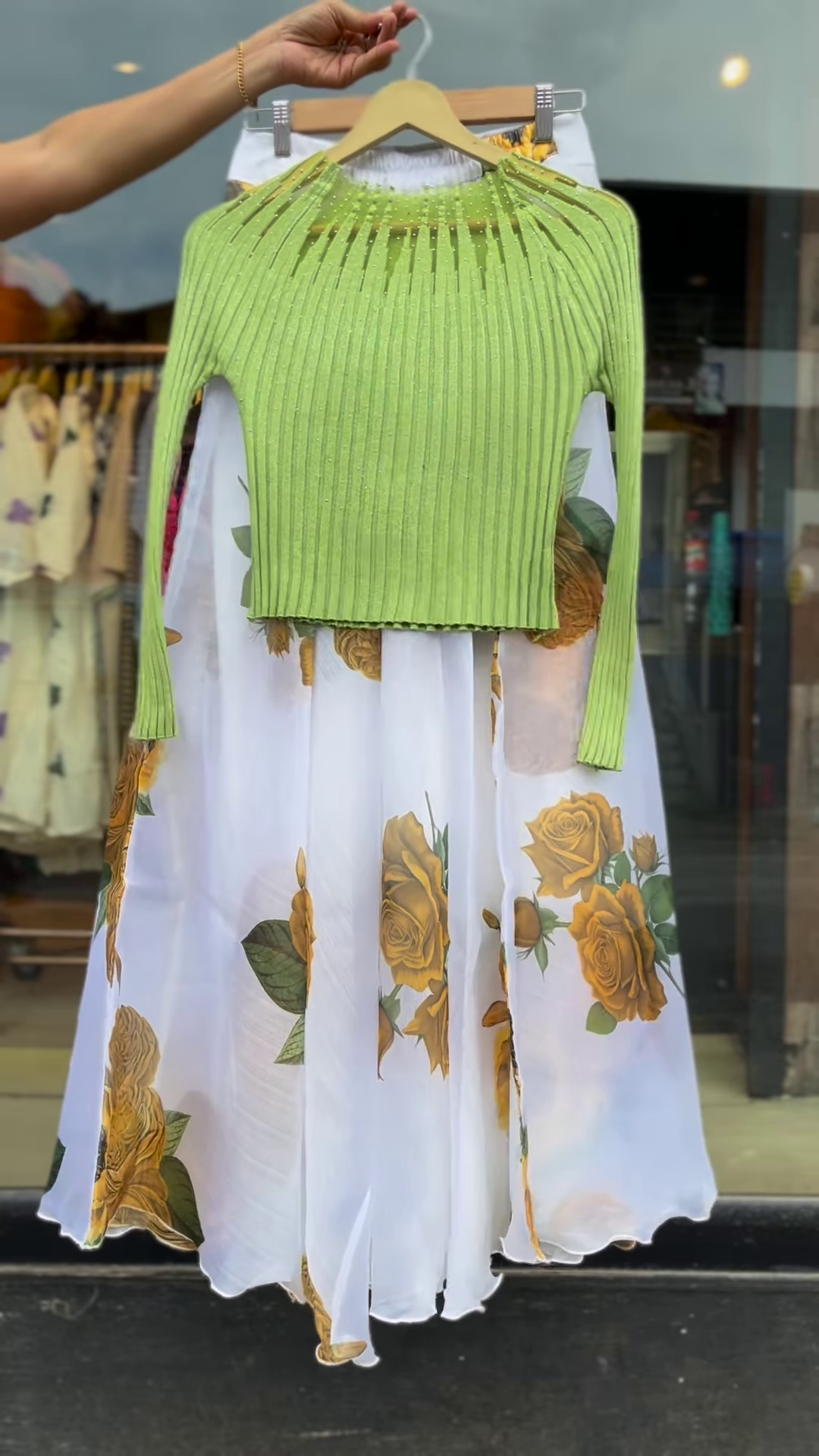 Photographed in a boutique-style mirror pose against warm wood tones, the look carries a handcrafted aesthetic that appeals to minimalists and trendsetters alike. It’s an easy choice for your customers seeking calm tones, light embroidery, and year-round wearability.
